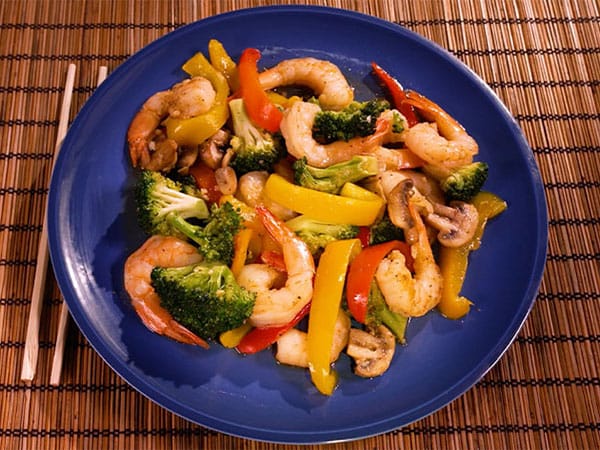 Ginger, garlic and soy sauce bring out authentic flavor that’s unbeatable. Remember: shrimp doesn’t take long to cook; and once you mix all the vegetables back in, you’ll have a healthy meal for everyone at your table.  This serves four (4) and takes just 30 minutes to prepare.